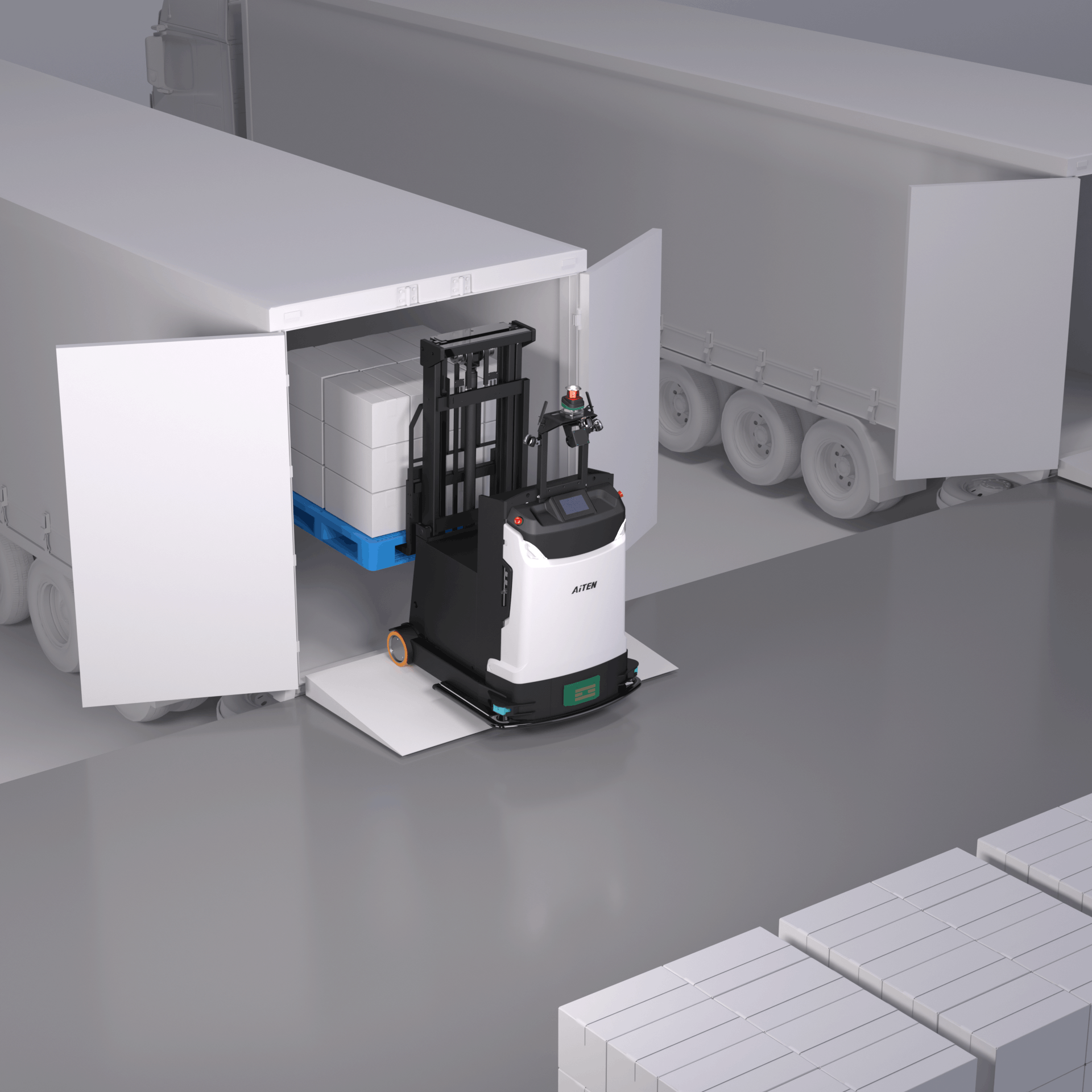 库内搬运:在仓库内部,无人叉车能够根据系统指令,在不同的货架区域、分拣区域、加工区域之间自主搬运货物。它们可以灵活穿梭于狭窄的通道,精准地完成货物的取放任务,提高仓库空间利用率和货物搬运效率。