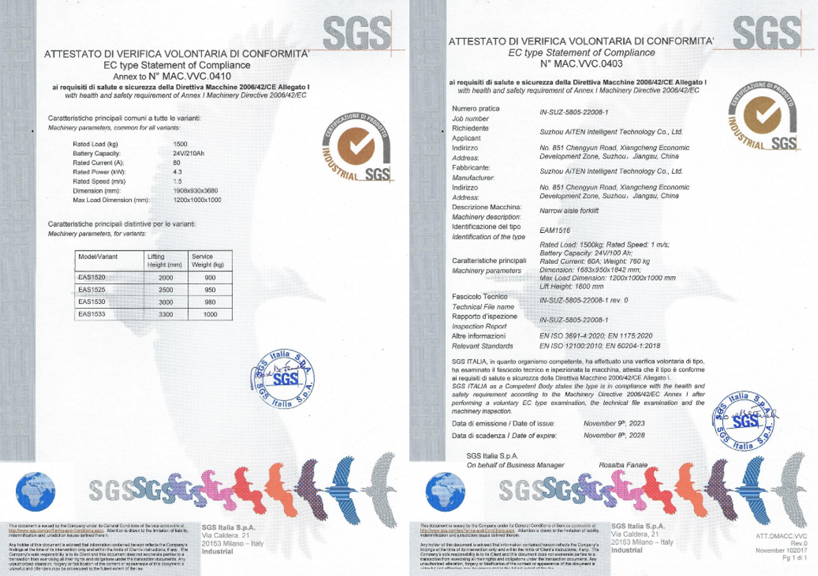 为满足欧洲市场监管要求,AiTEN 经过严格审核并获得欧盟 CE 认证,涵盖 MP10s、AM1516、AE15、AS15 等 AGV 产品